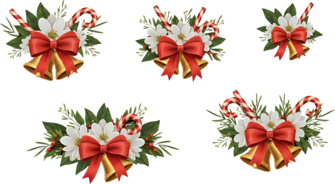 Festive Christmas decorations featuring golden bells red bows white flowers candy canes green foliage and red berries presented in multiple arrangements