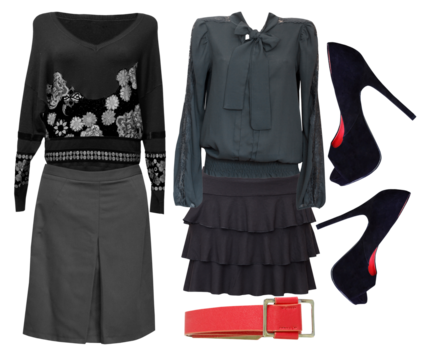 sophisticated ensemble featuring a black sweater, gray skirt, black heels, and a red belt, perfect for fashion blogs and style guides, photographed in high quality.