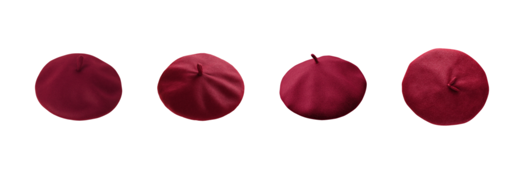 Red Beret Hat Collection Set. Fashionable Headwear And Style Accessories Collection Isolated On Transparent Background