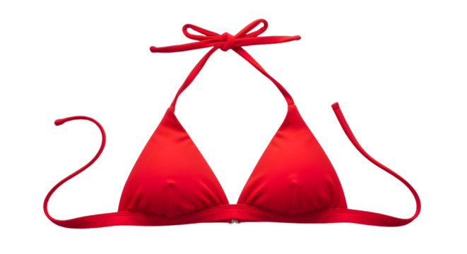Vibrant red bikini top with halter neck ties, isolated on white background.