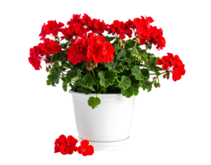 Vibrant red blossoms atop lush green leaves in a simple brown pot