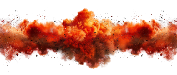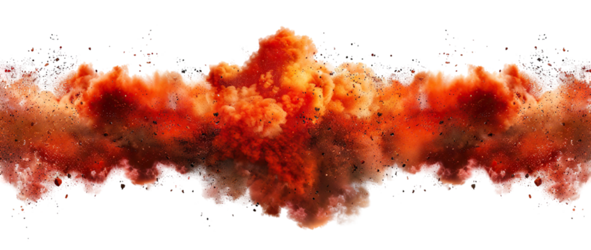 Explosion creating fire and black smoke cloud with flying debris, dramatic blast effect on transparent background