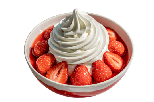 A close-up shot of a delicious dessert featuring a generous swirl of white whipped cream or soft-serve ice cream, surrounded by fresh red strawberries and strawberry sauce in a white and red bowl.