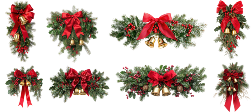Christmas wreath with red bows and bells, decorated with holly and berries, png transparent