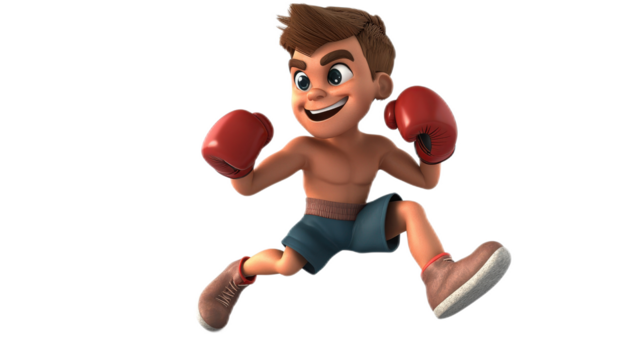 Energetic Cartoon Boy in Red Boxing Gloves Jumping with Joyful Expression and Athletic Attire for Sports Themes