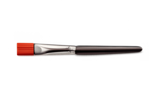 Paintbrush with flat synthetic red bristles and dark handle on transparent background for art and creative projects