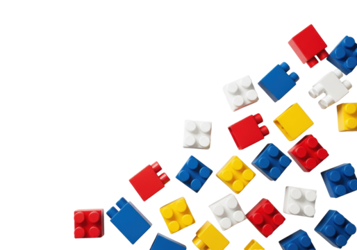 Photorealistic studio flat lay of scattered vibrant red, deep blue, sunny yellow, and crisp white plastic building blocks on transparent background with large copy space. Concept of childhood learning