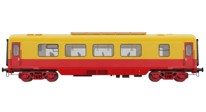 Isolated railway carriage in red and yellow, train car for passenger transport vehicle
