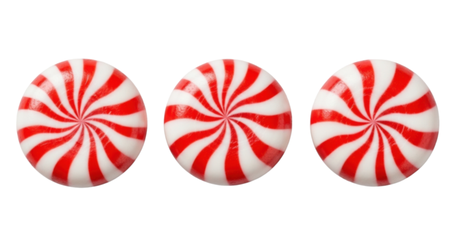 Three round classic peppermint candies, vibrant red and white swirls, glossy, reflective, on seamless transparent, high-angle studio shot, commercial product photography concept