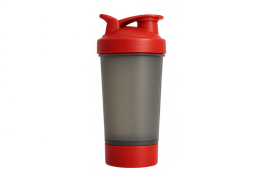 Protein shaker bottle, red cap and base with grey opaque container, fitness drinkware, for gym workout supplements isolated