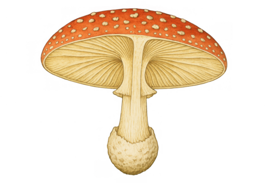 Fly agaric mushroom with red cap and white spots, amanita muscaria, poisonous toadstool fungus, autumn nature on transparent background