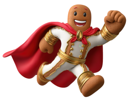 Gingerbread man superhero cartoon red cape white suit gold trim smiling joyful running festive character isolated on transparency background