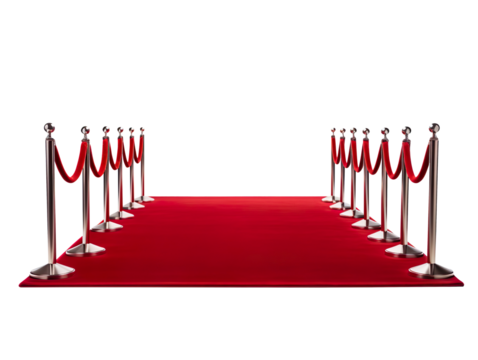 Red carpet event stanchions with velvet ropes leading to a bright red carpet, isolated on a white or transparent background, cutout, PNG