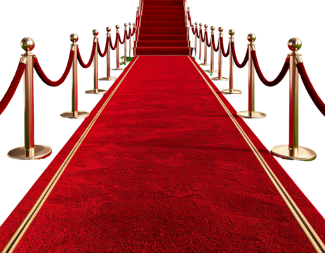 Elegant red carpet entrance with gold stanchions for a special event or awards ceremony arrival on transparent background