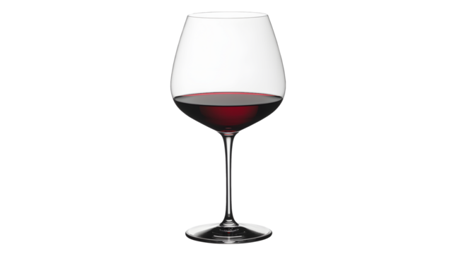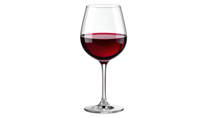 Elegant clear glass goblet filled with deep red wine beverage presented on a transparent background with subtle highlights and reflections showcasing the rich color and clarity of the liquid