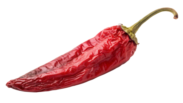 A single dried red chili pepper with stem on a plain surface on transparent background