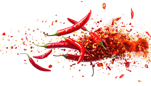 Pile of spicy red chili flakes with seeds, hot crushed pepper seasoning, transparent background