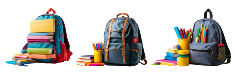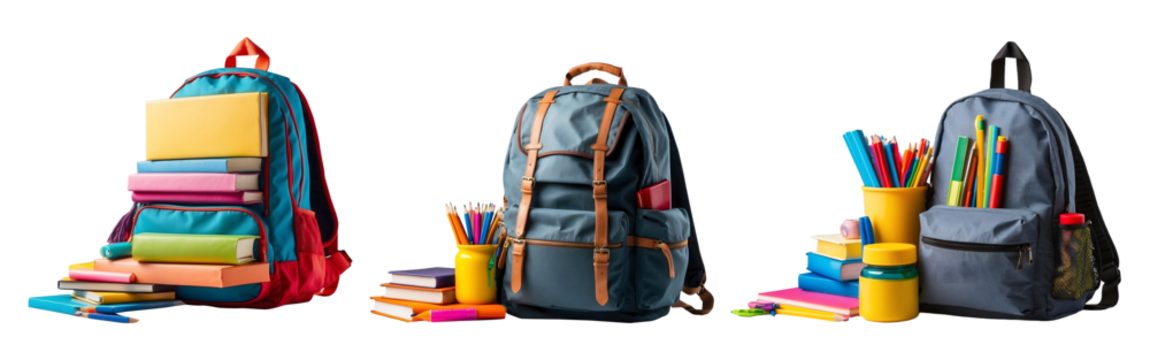 Set of Student’s Backpack with School Supplies Isolated on a Transparent Background