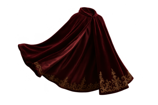 Elegant red velvet cape with golden embroidery isolated on transparent backdrop