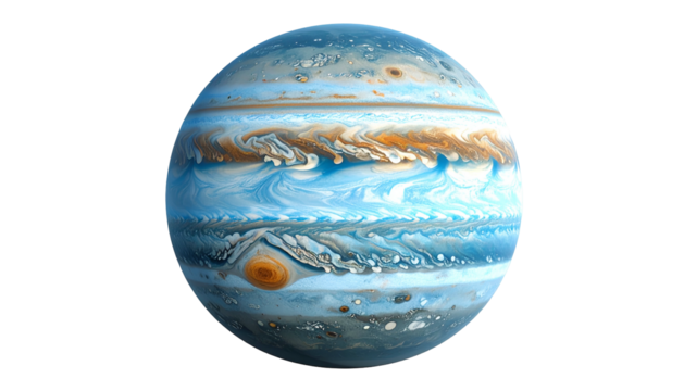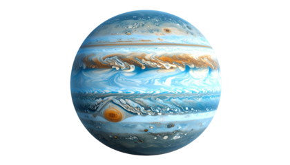 A vibrant, detailed depiction of a gas giant with swirling cloud bands and a large red spot