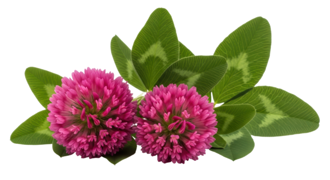 Top-down view of pink clover flowers with green foliage isolated on transparent background PNG