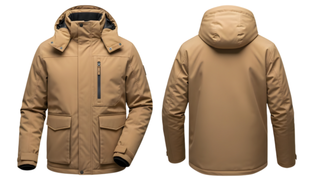 Sleek red winter coat front and back mock up with fur lined hood and zipper details isolated on transparent background