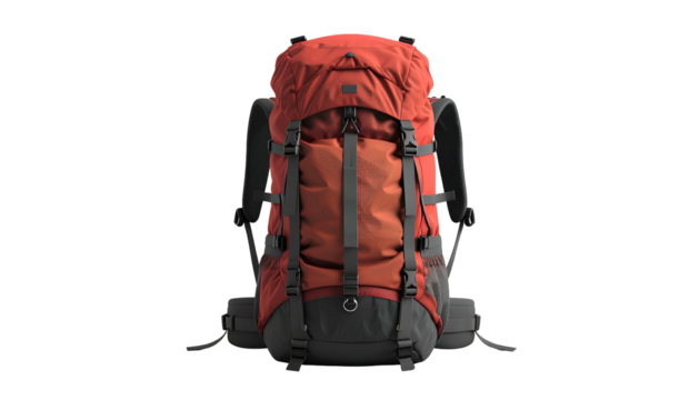 A front view of a fully loaded red and gray hiking backpack on a black background