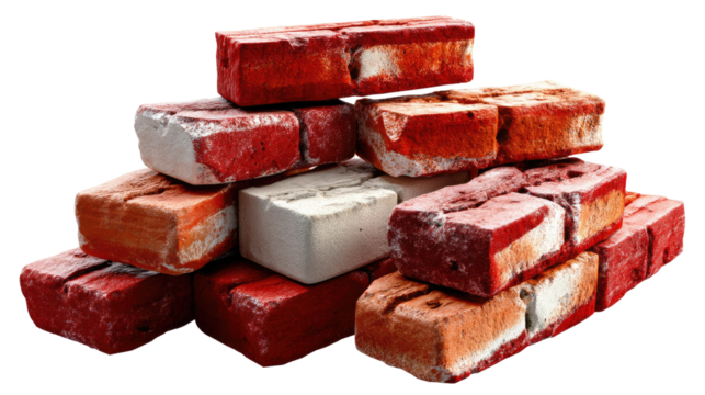 Cracked, broken, and stacked red clay blocks, some disintegrating, against a black background