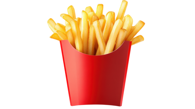 Golden French fries served in a red container, perfect for snacking, PNG, transparent background