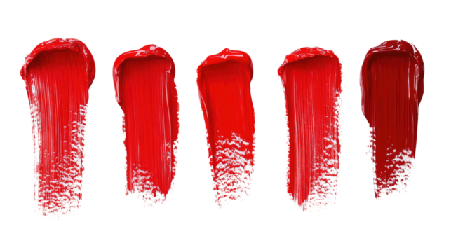 Five vibrant red paint strokes on a clean white background showcasing texture and color variation