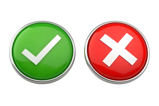 A pair of 3D rendered icons: a green checkmark and a red cross mark on circular buttons.