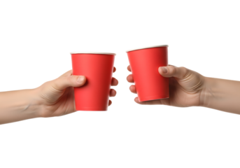 Hands holding red cups toasting celebration cheers party festive drink . Isolated on transparent background, png