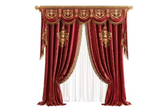Red curtain, theater stage. Red Satin Border isolated on transparent background, png.