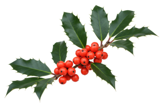 Isolated sprig of bright red holly berries with sharp green leaves on an even background
