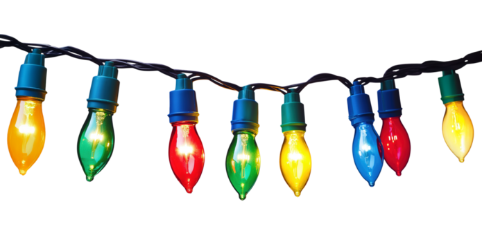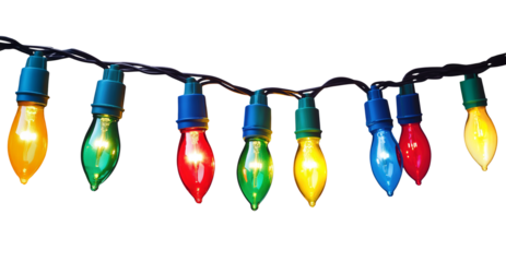 A string of colorful Christmas lights with bulbs lit up in red, green, blue, and yellow isolated on transparent background