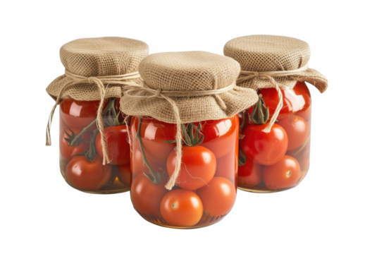 Three jars of tomatoes are sitting on a white background