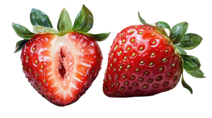 Juicy Delight: Two vibrant, freshly picked strawberries, one halved to reveal its succulent interior, showcasing the natural beauty and taste of the ripe fruit.