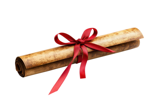 Rolled diploma document tied with a red ribbon representing education, graduation, success, and achievement on transparent background