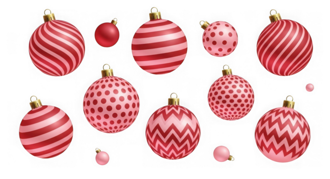 Three watercolor christmas tree ornaments hanging, one red and white striped, one green striped, and one green with red and white dots, isolated on transparent background