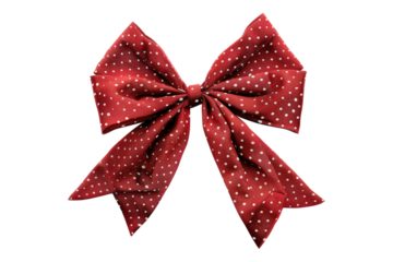 Red hair bow ties with transparent polka dots in various styles and arrangements isolated on transparent background with a person wearing one at the right.