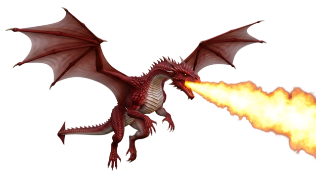 Red dragon, breathing fire, cutout, PNG isolated on white or transparent background