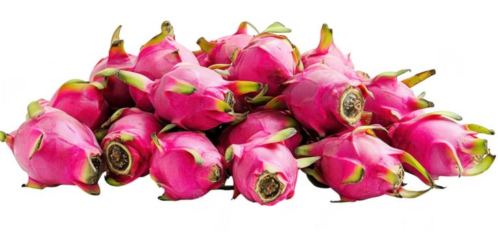 A pile of fresh dragon fruits. their bright pink skin and green tips. arranged attractively against a clean white background. ideal for culinary or health-related content