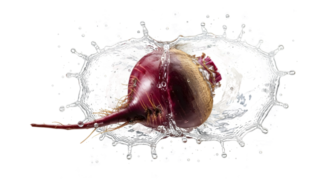 Fresh vegetables, including a red onion and a brown shallot, splashing in water, isolated on a transparent background with a dynamic splash effect.