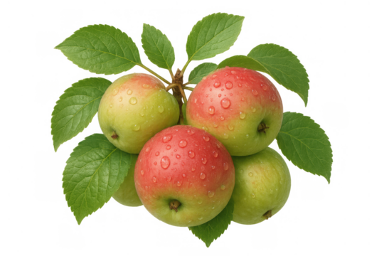 Fresh ripe red and green apples with water droplets and green leaves, transparent background
