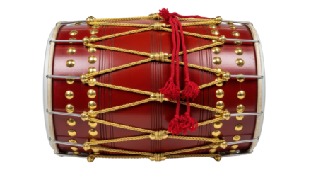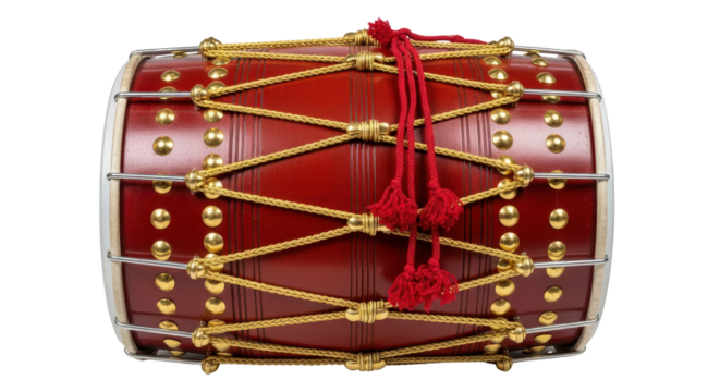 Intricate ethnic dholak drum featuring vibrant red floral motifs, perfect for cultural music events,isolated on white background