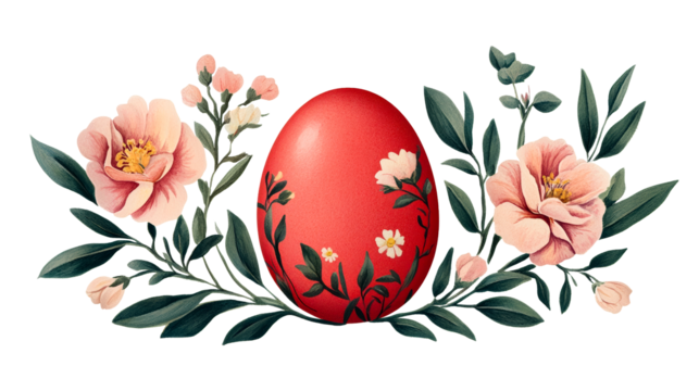 Red Egg and Flowers Artwork, Floral Adornment, Springtime Celebration, cut out transparent