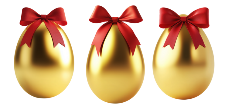Golden Easter egg with red bow on top, isolated on white transparent background. Symbol of luxury, celebration, and holiday festivity