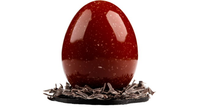 Decorated chocolate egg is presented with a red ribbon and delicate swirls against a isolated background.