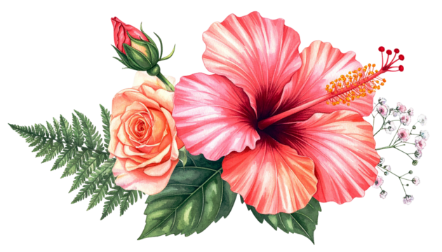 Transparent pink hibiscus with monstera and fern leaves illustration