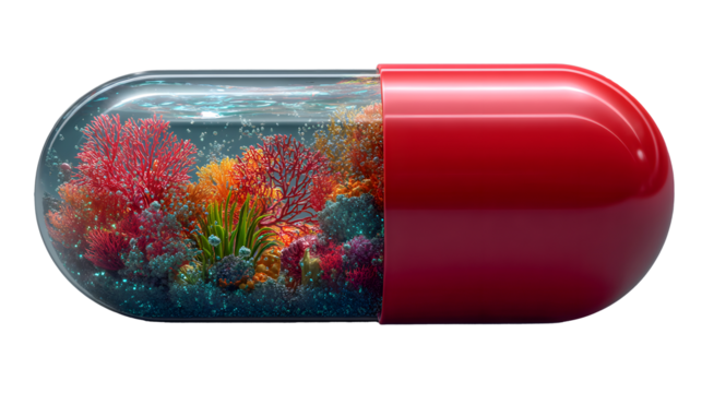 Vibrant coral reef ecosystem flourishing inside a transparent capsule showcasing marine life and environmental preservation.